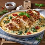 Manche Gerichte sind mehr als Nahrung; sie sind eine Umarmung von innen. Unser heutiges Rezept: ein wahrhaft wunderbares Hähnchengericht aus dem Ofen. Es entfacht mit Saure Sahne und geschmolzenem Käse eine Geschmacksexplosion. Zartes Hähnchenfleisch, umhüllt von samtiger, leicht säuerlicher Soße, überbacken mit goldbrauner Käsekruste, die bei jedem Bissen knuspert und zerläuft.